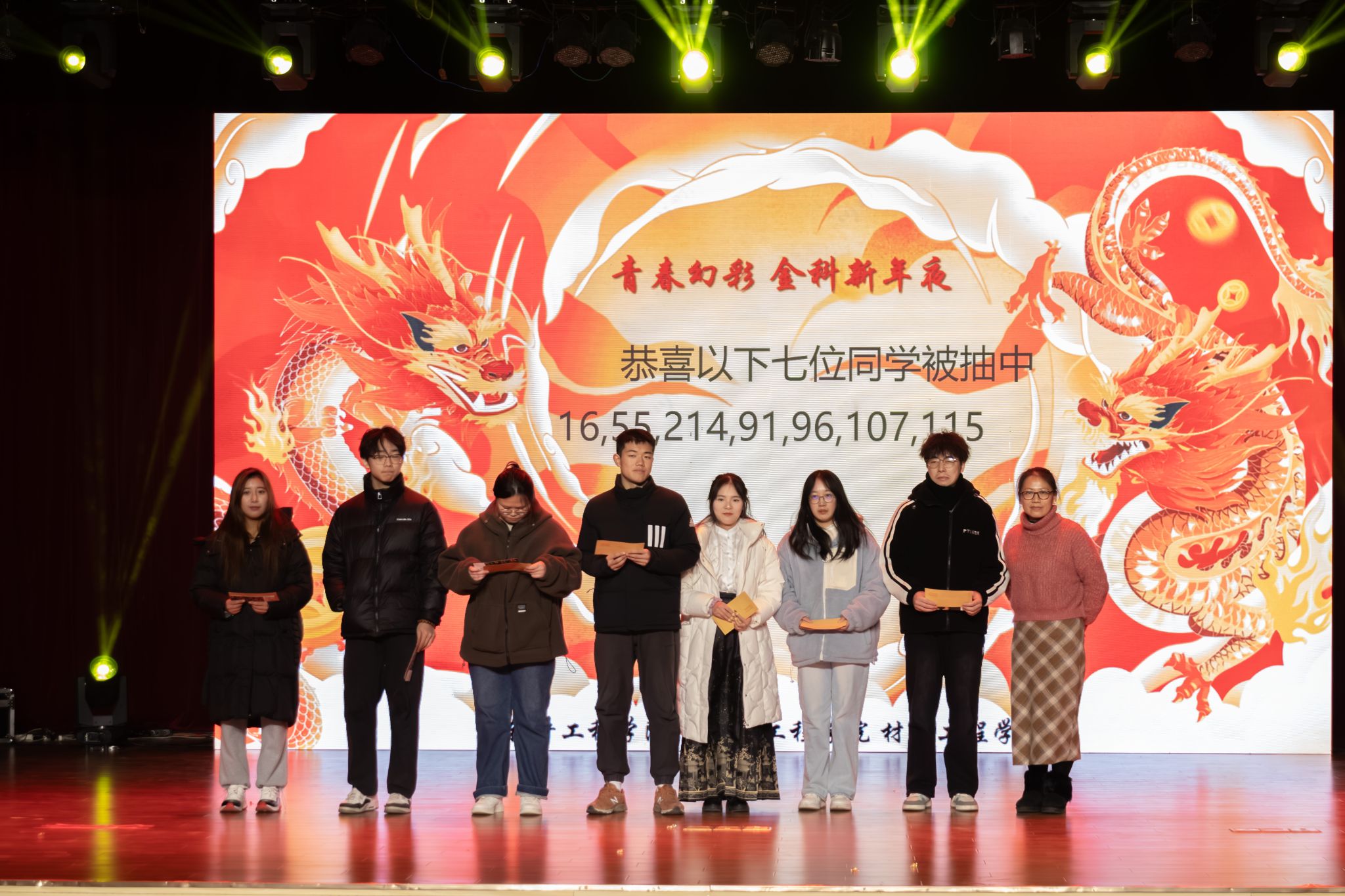 晚会开始前,各院领导、员工代表通过微视频向同学们送来新年的祝福,公司党委副书记陈智慧对2023年学习、科研、实践等各方面取得的优异成绩做了总结,寄语同学们珍惜时间、勤奋学习、挺膺担当。晚会的节目精彩纷呈,第一幕“跃动青春”中,公司陈域用柔美曼妙的舞姿演绎《入画江南》,唐睿、柳承志用磁性的嗓音献唱《飘向远方》,他们将歌舞中蕴含的情感表达地淋漓尽致。接着来到激动人心的抽奖环节,在副书记陈智慧的倒数声中,七位幸运儿诞生,他们怀着激动的心情走上舞台领取奖品。第二幕“幻彩金科”中,公司伍彬玥、张雨欣共赋一曲《战台风》,她们的指尖在琴弦上灵活跳跃,行云流水般的演奏流淌出动人的旋律。第三幕“绽放未来”中,公司姚骏鸿和张郁垚合作献上小提琴钢琴二重奏《匆匆那年》,琴弦和琴键迸出的旋律交织在一起,时而缠绵悱恻,时而激烈碰撞,演绎出一曲令人陶醉的乐章;随后公司刘文强、李洁等人带来热情洋溢的舞蹈串烧,以激情和力量诠释每一个节拍,将舞蹈的动感传递给观众。兄弟学院的节目也是精彩纷呈,气氛热烈。最后,整场晚会在大合唱《稻香》中圆满落下帷幕。