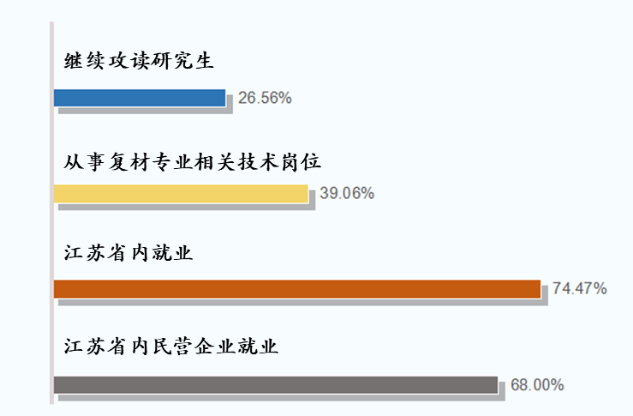 根据2019届毕业生签订的三方协议,对毕业生出口能力和就业方向与培养目标的吻合情况进行分析。截止2019年9月12日,2019届复合材料与工程共有64名员工拿到学位证和毕业证顺利毕业,他们的工作单位、单位所在地、行业领域等信息见附录2.3。其中,有17名毕业生攻读本专业相关研究生或出国深造,经过进一步的学习可以成长为高层应用型、研究型或管理型人才,占毕业生的26.56%;25名毕业生从事复合材料与工程专业相关技术岗位,符合在材料及相关行业开展技术、工艺和产品研发活动的培养目标要求,占毕业生的39.06%;少数毕业生从事建筑、商务、金融等相关工作。就业的员工中,已签订三方并在江苏省内工作的有35名,占就业毕业生的74.47%,符合学校和专业服务地方的人才培养定位;江苏省复合材料领域的民营企业活跃,68%的员工在江苏省民营企业工作,说明本专业培养目标符合行业发展需求。上述分析数据详见图2-5。毕业生认为培养目标中,应加强复合材料与工程实践能力的培养,有助于在就业中获得较好的竞争力。